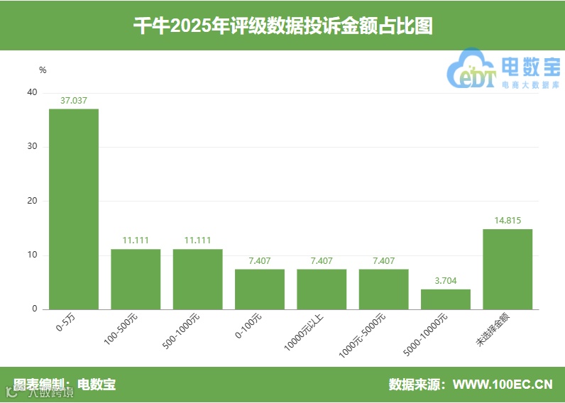 用户投诉“千牛”的消费金额主要在0-5万、100-500元、500-1000元、0-100元、10000元以上、1000-5000元、5000-10000元、未选择金额区间。