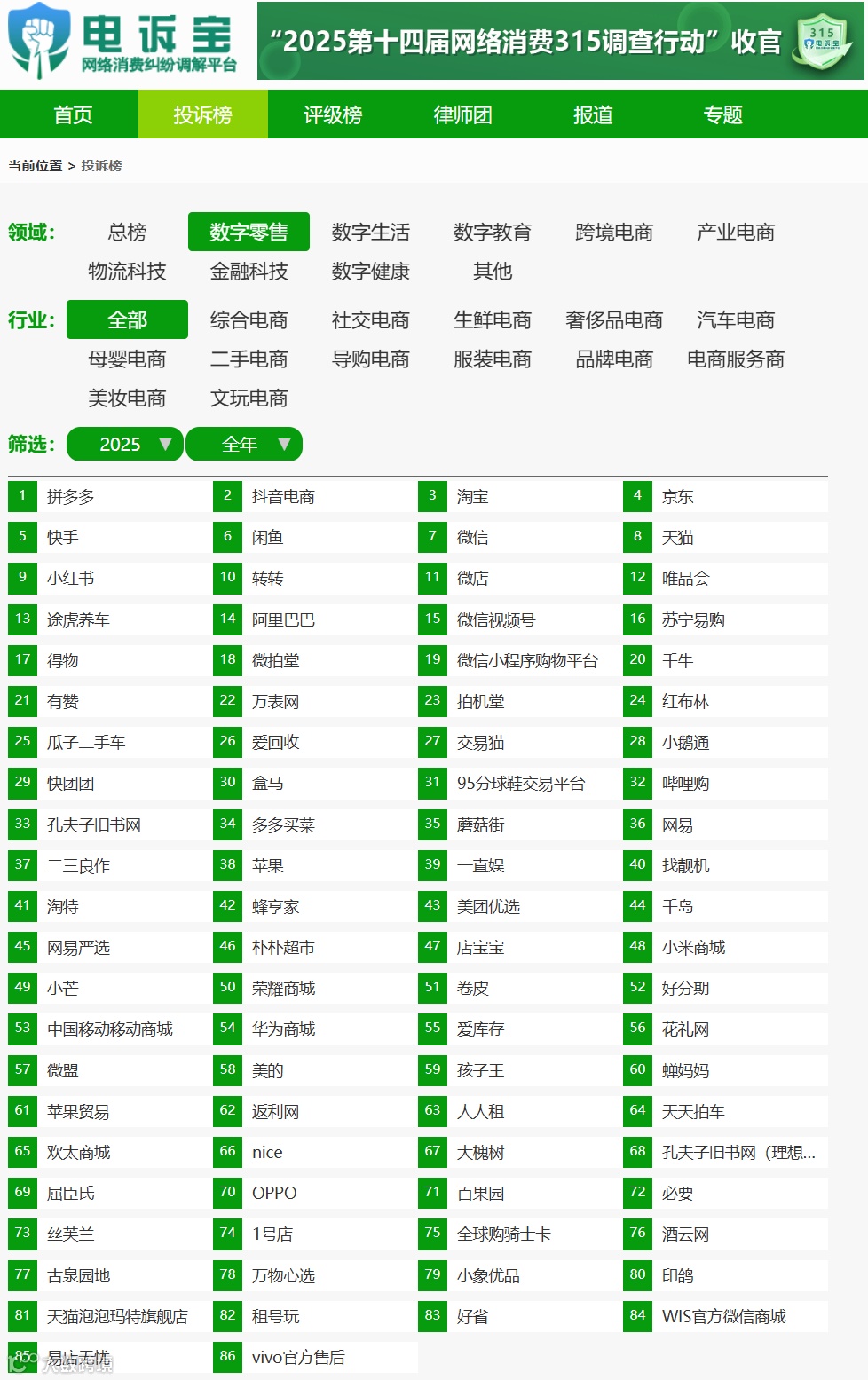 在“2025年数字零售投诉榜”中,上榜平台86家:
