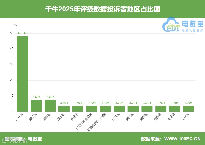 根据网经社旗下电商大数据库“电数宝”显示,2025年投诉“千牛”的用户主要集中地区为广东省(48.148%)、浙江省(7.407%)、福建省(7.407%),其于分别为:四川省、天津市、广西壮族自治区、新疆维吾尔自治区、江苏省、河北省、河南省、海南省、湖北省、辽宁省。