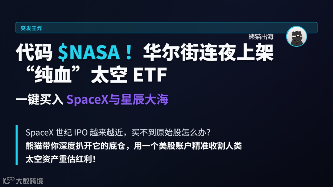 资本的嗅觉永远比我们敏锐。为了服务全球急于押注太空经济的投资者,华尔街刚刚连夜发售了一只全新的太空主题ETF。它的股票代码极其嚣张,直接就叫:$NASA。