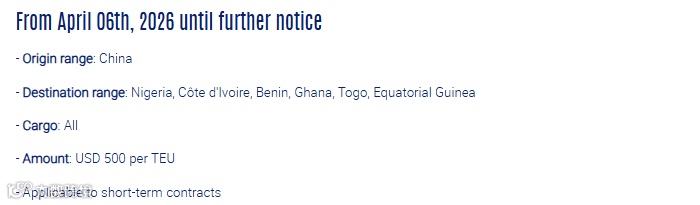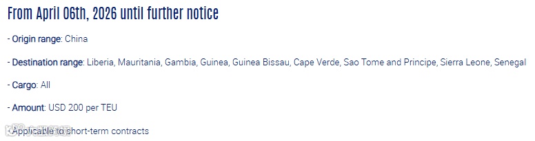 同时,马士基还对中国及东南亚多地出口至莫桑比克、马达加斯加、赞比亚等非洲国家的航线征收旺季附加费,标准为20尺柜150美元、40尺柜300美元,同样自4月13日生效。