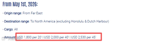 自5月1日起,达飞对远东出口至北美(不含檀香山和荷兰港)的所有货物征收旺季附加费,标准为20尺柜1800美元、40尺柜2000美元、45尺柜2530美元。