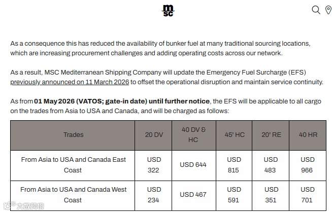 地中海航运:紧急燃油附加费再上调,亚洲至美加航线成本增加