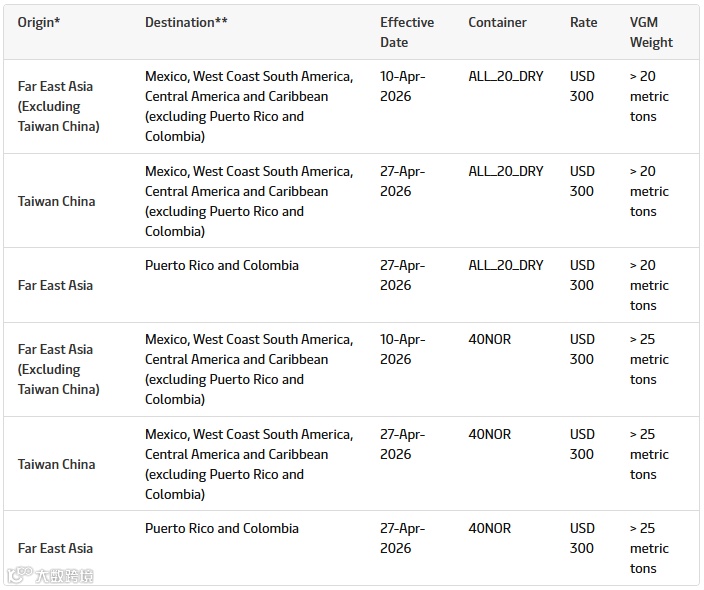 此外,马士基对远东至拉美航线新增超重附加费,超重集装箱每箱加收300美元,分两批次于4月10日及4月27日实施。