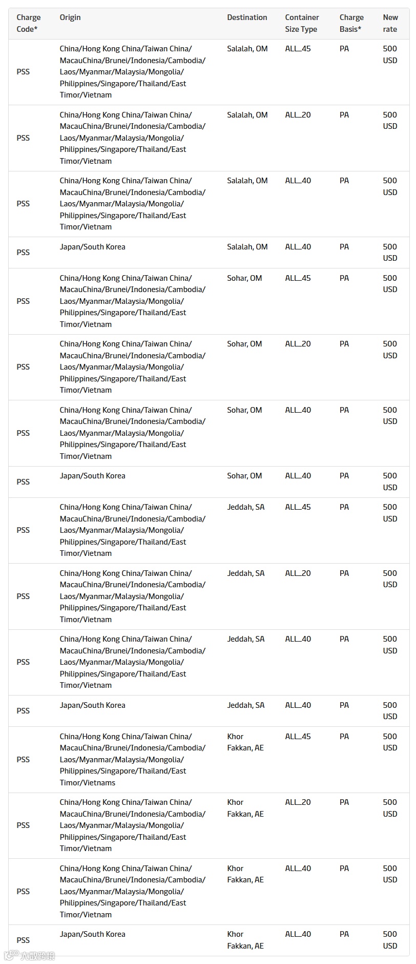 在亚太至中东航线,马士基统一征收每箱500美元的PSS,已于3月30日生效。
