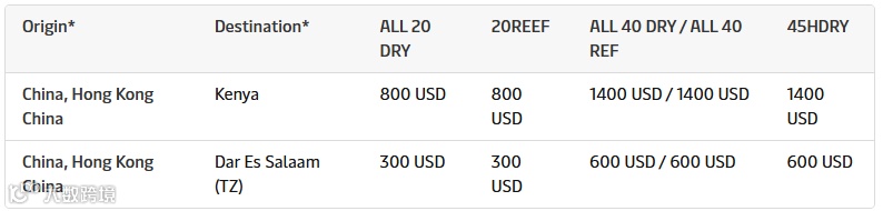 针对中国(含香港)至肯尼亚及坦桑尼亚达累斯萨拉姆航线,马士基自4月13日起征收旺季附加费。其中,至肯尼亚方向20尺柜800美元、40尺柜及45尺柜1400美元;至达累斯萨拉姆方向20尺柜300美元、40尺柜及45尺柜600美元,冷藏箱与干箱标准一致。