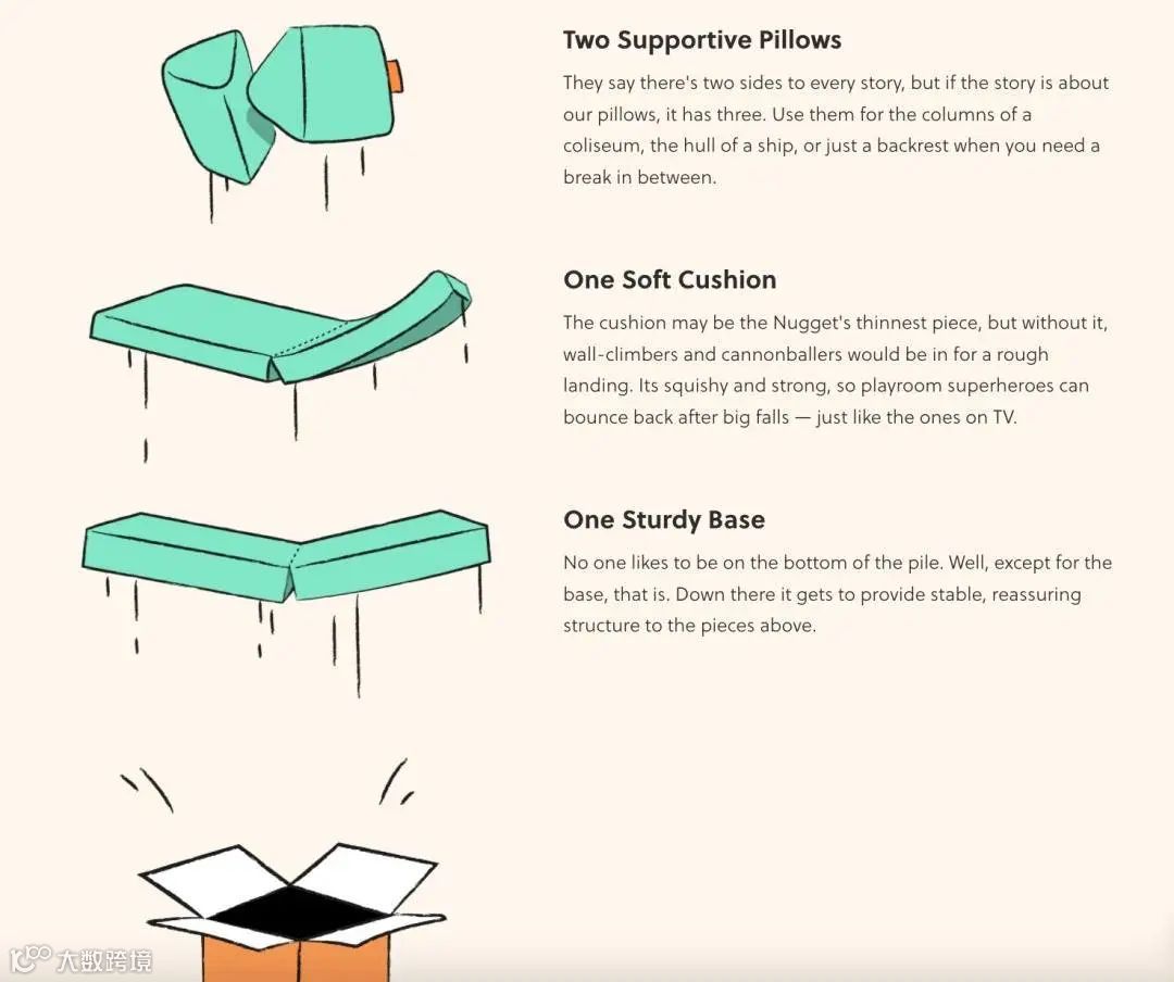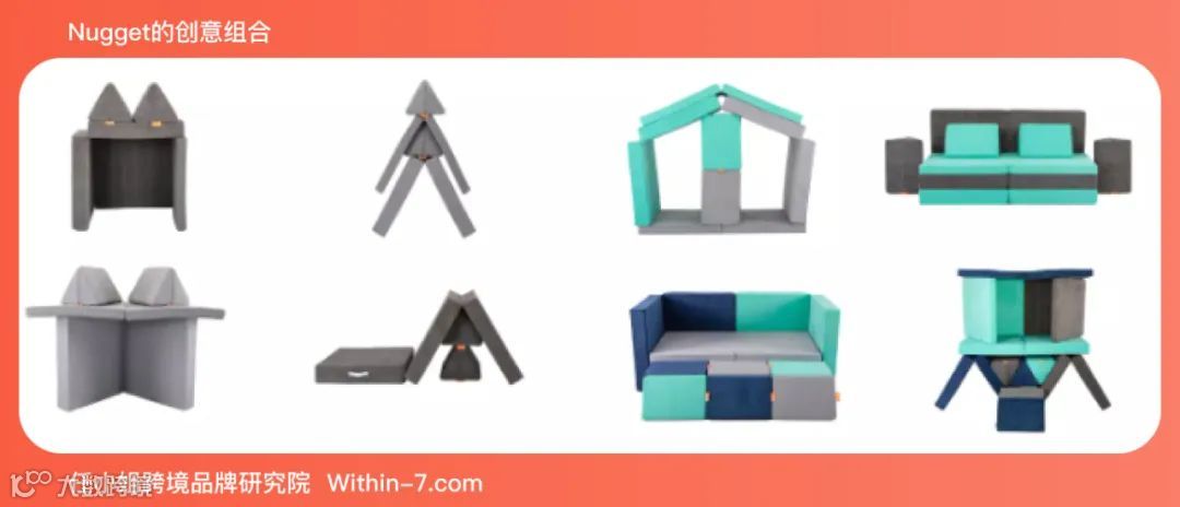Nugget的主打产品就一个产品:玩具沙发。由 4 个独立部件组成:一个可折叠硬垫、一个可折叠软垫、两个三角形靠枕。