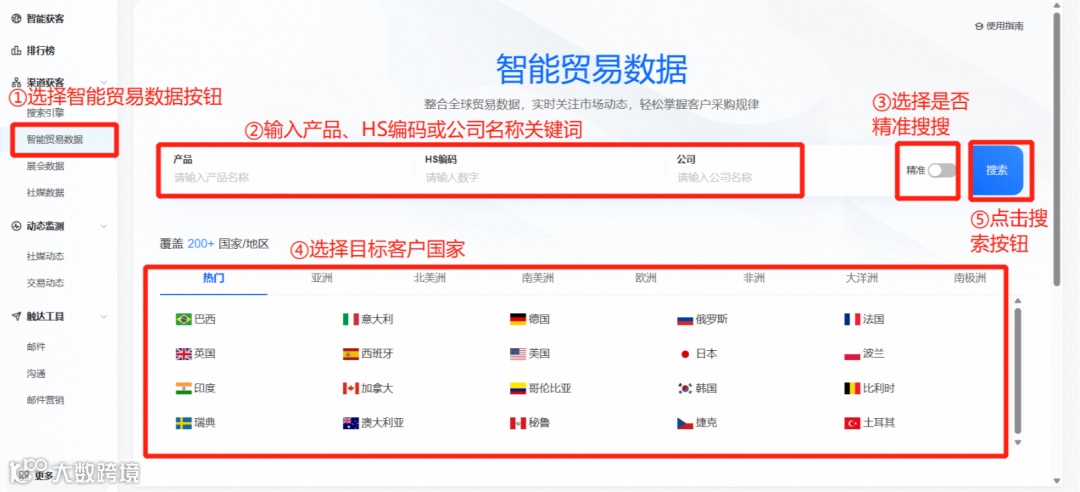 企业可借助海关数据软件,通过产品关键词、HS编码或竞争对手英文名进行搜索。搜索后进入客户列表页,建议设置以下精准筛选条件:时间范围、数据来源国、贸易类型、采购商/供应商信息、物流及无效联系人过滤。