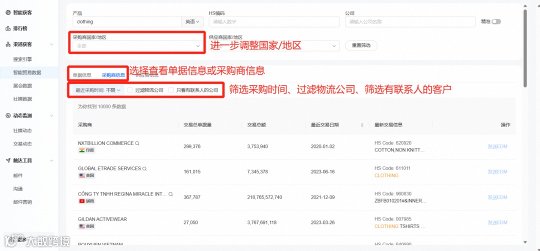 通过产品关键词或HS编码,企业可筛选全球真实采购商,同步获取其采购频率、规模及交易金额,有效识别高价值客户群体。
