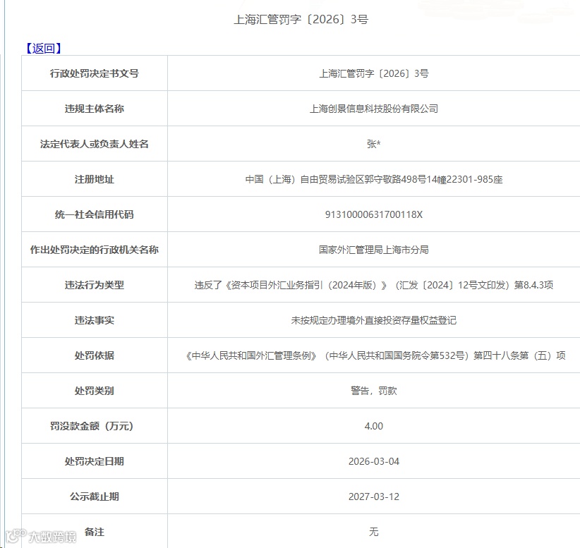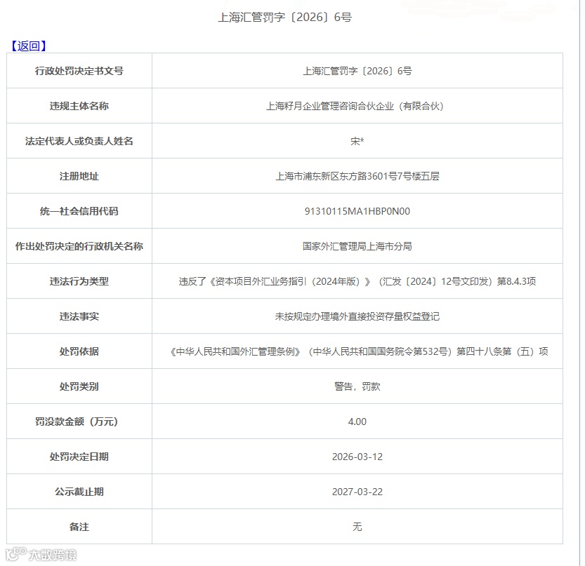 近日,国家外汇管理局官网显示有两家企业:上海籽月企业管理咨询合伙企业(有限合伙)、上海创景信息科技股份有限公司未及时办理存量权益登记被罚。
