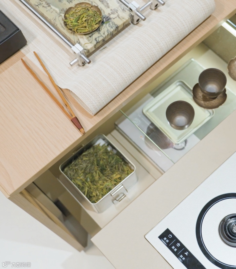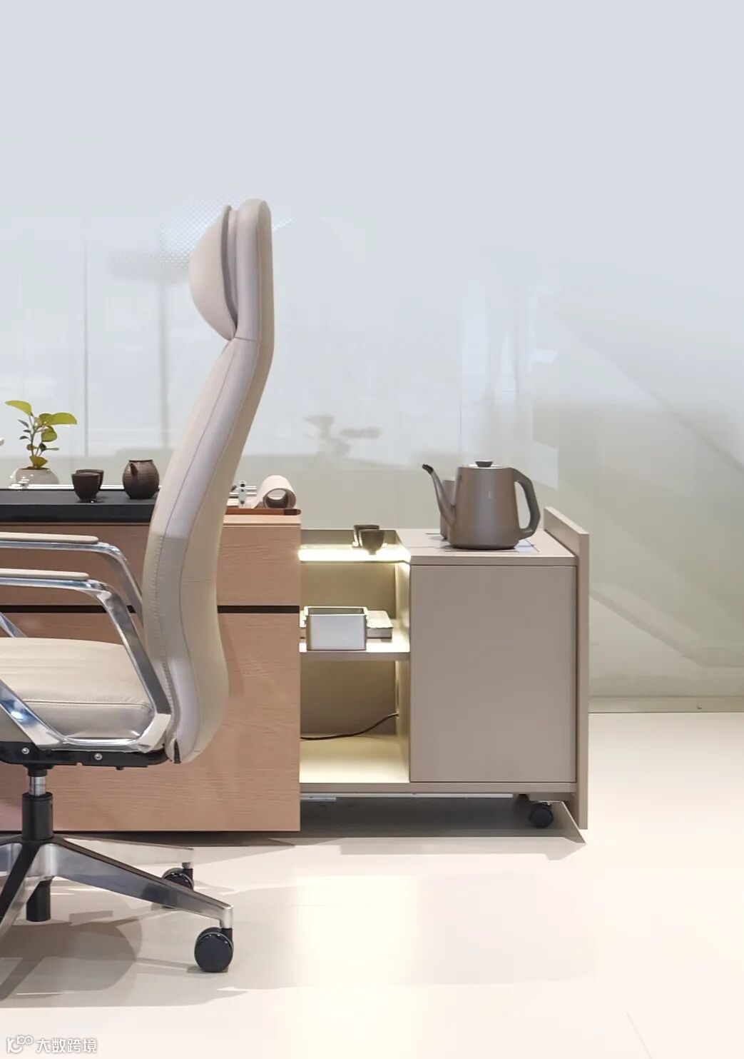 格锐的特别之处,藏在侧柜里。 侧柜处,一方茶台静候。这方寸之间,是东方待客之道的现代转译——不谈生意时,这里是静思的角落;接待来客时,这里是对坐清谈的所在。