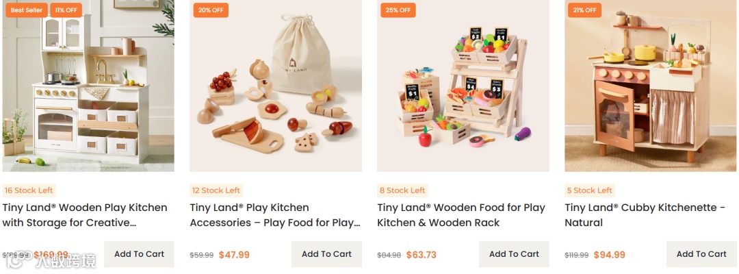 产品定价50-200美元“轻奢区间”,虽高于塑料玩具,但比欧洲品牌更具性价比,精准契合千禧一代父母消费偏好。核心品类涵盖木制儿童厨房(高度还原真实结构,培养动手能力与想象力)、帐篷、攀爬玩具及蒙氏教育产品,其中儿童厨房系列最为畅销。