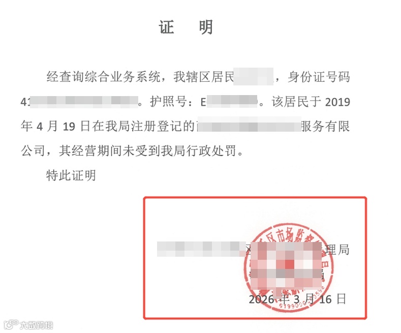 无市场监管处罚证明:由中国当地市场监督管理局出具,证明个人没有被法院判决禁止从事经营活动,用以核查投资者的个人信用与合规背景。