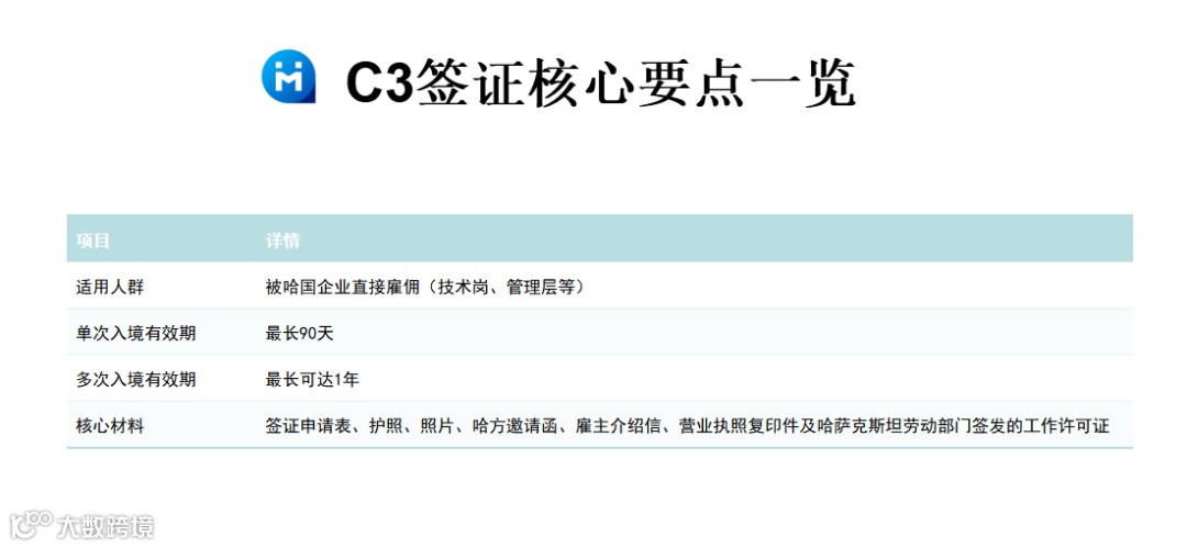 C3签证适用于已获得哈国企业直接雇佣合同的技术人员、管理人员等,通常在用人单位已取得外国劳动力引进许可后,由用人单位作为邀请方申请签发。