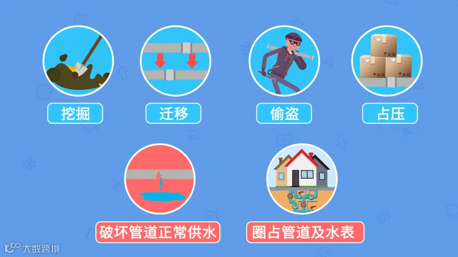 指未经水司同意,擅自挖掘,迁移,偷盗、占压供水管道及附属设施的行为。特别是破坏管道正常供水、圈占管道及水表的行为。