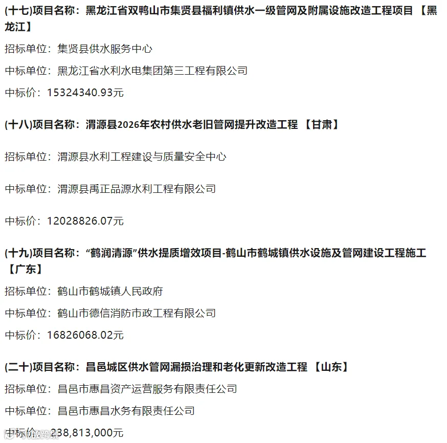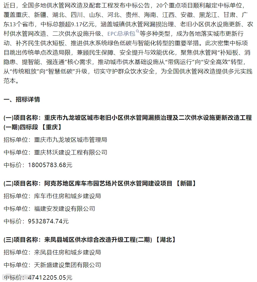 20标超9.17亿!全国13省市供水管网改造项目密集落地