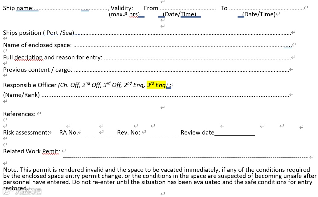 许可有效期严格限定8小时,须由船长或授权责任人签发,附带可追溯风险评估记录。执行"双人监护"制度,严禁单人进入。入口实施物理状态标识(SAFE/UNSAFE),危险区域须锁闭管理。