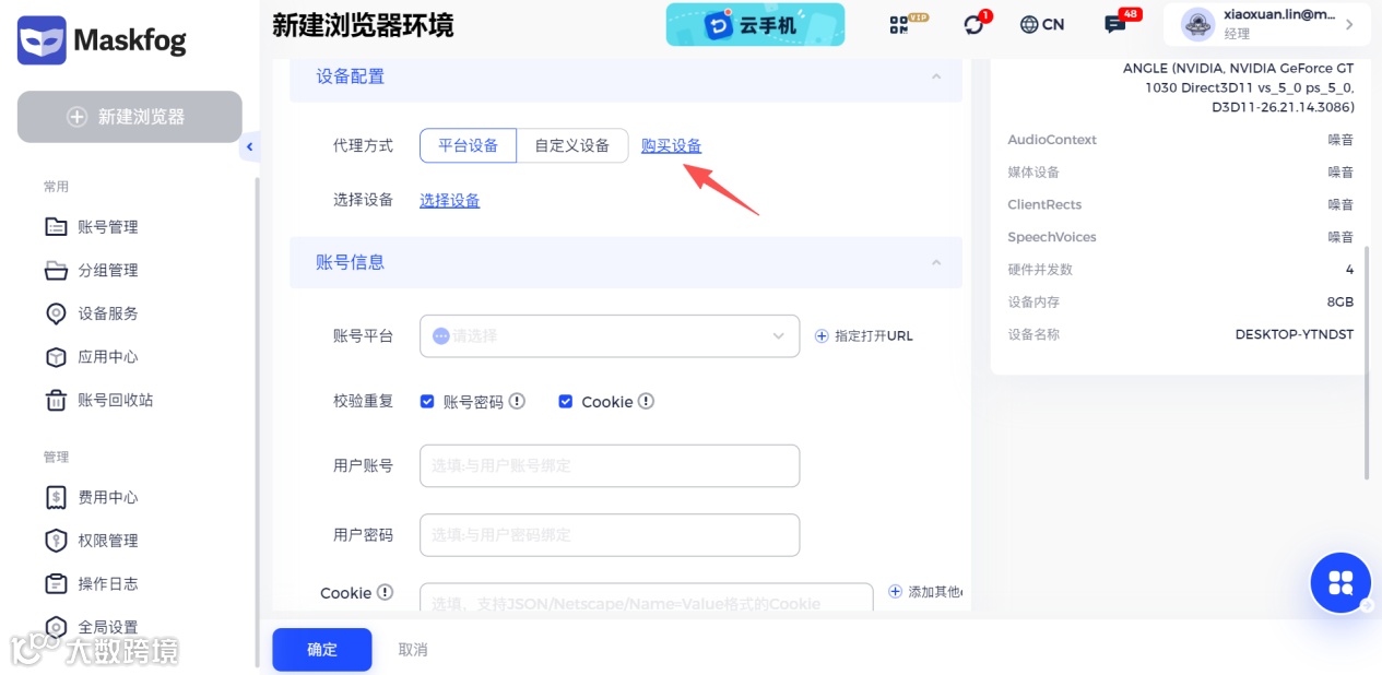 - 指纹参数差异化: 避免手动重复设置。建议利用 Maskfog 自带的随机指纹库生成功能,参考真实设备的主流配置分布(如不同的显卡型号、分辨率组合),确保每个环境既唯一又符合常理。