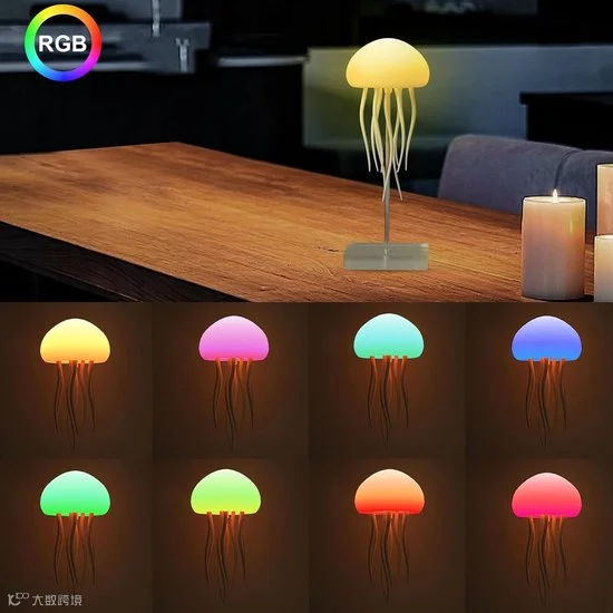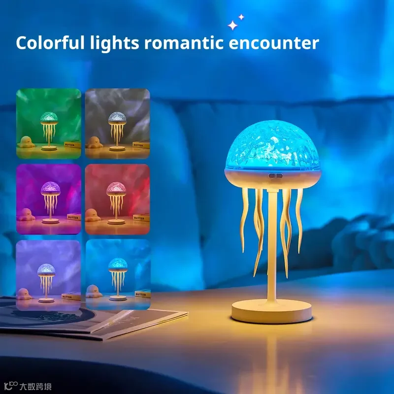 这款产品的工业设计就是冲着“催眠”去的。一个极其极简的透明亚克力圆柱体,内部注满水。底部的微型静音水泵制造出极其微弱的暗流,推动着两只高仿真的硅胶水母。当底部的 RGB 灯珠亮起深邃的蓝紫色渐变光时,水母那柔软的触手会跟随着水流极其优雅、舒展地上下浮动。这根本不是一个照明工具,而是一个在喧嚣现实中强行撕开的“深海假窗户”。