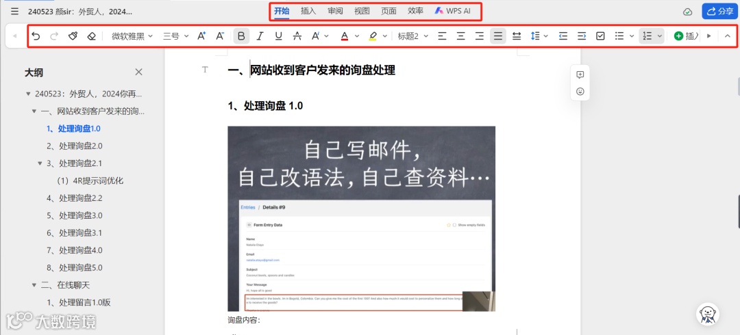 在金山文档中,可以通过大纲设置H1-H4这4个层级结构,左边栏为导航目录,帮助用户快速找到所需内容。