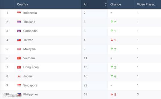 Tik Tok 在东南亚市场表现出色,在印尼、泰国、越南、马来西亚和菲律宾等国家 Google Play 总榜单排名均居前列。除菲律宾外,其他四个市场在视频子榜排名均为第一。