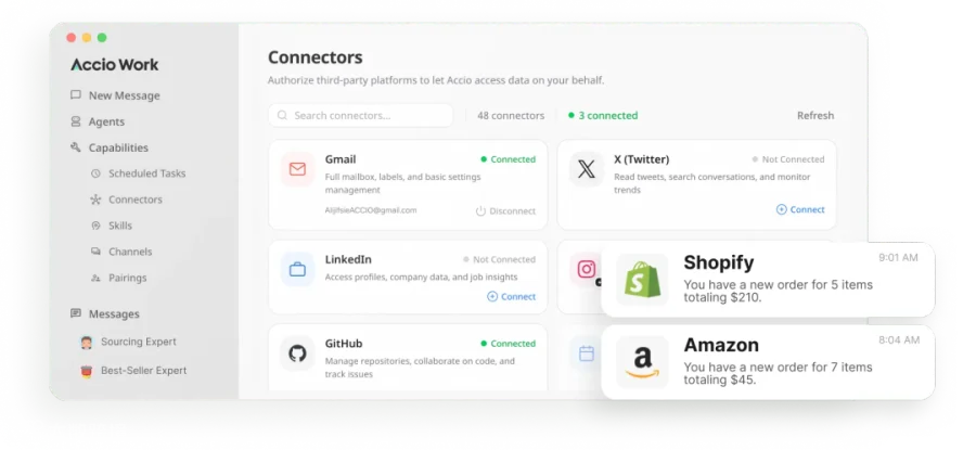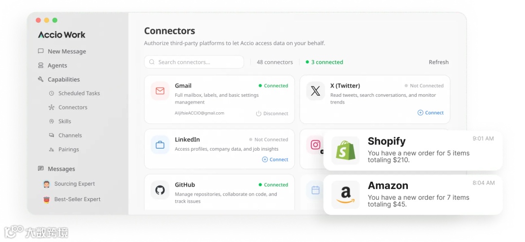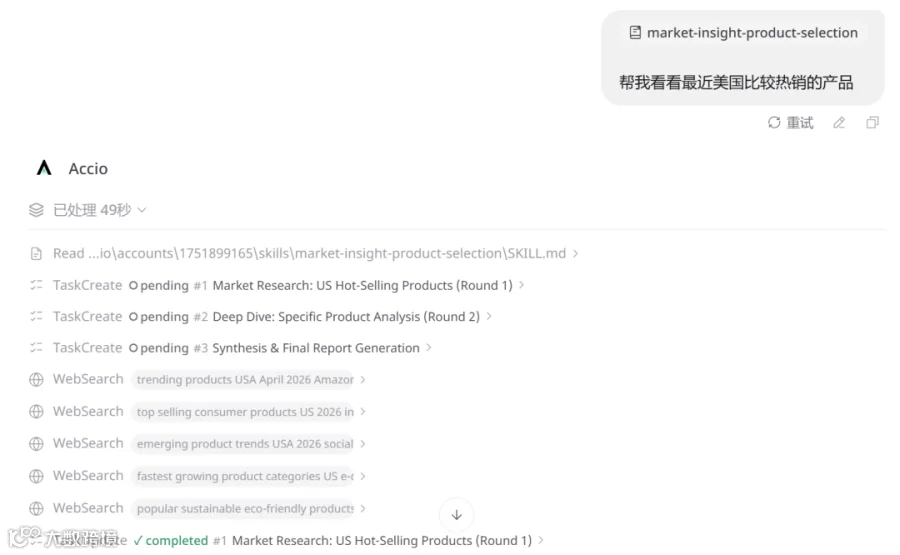 外贸业务特征为“单动作简易但流程繁琐”:资料搜集、话术优化、邮件跟进等重复任务耗时耗力。Accio Work整合Agent、浏览器自动化及连接器功能,将七步操作简化为单链路执行。