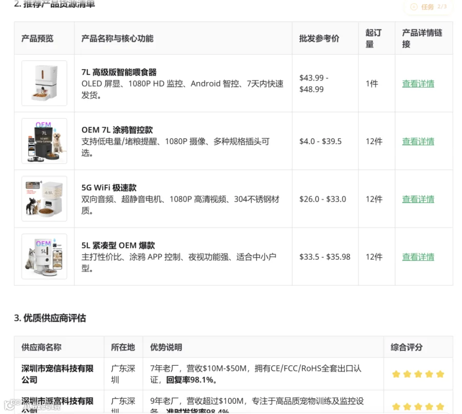 将市场分析、供应商比对、成本核算与谈判衔接为完整链条:自动输出品类可行性报告,并衍生报价逻辑、MOQ协商及英文邮件模板。