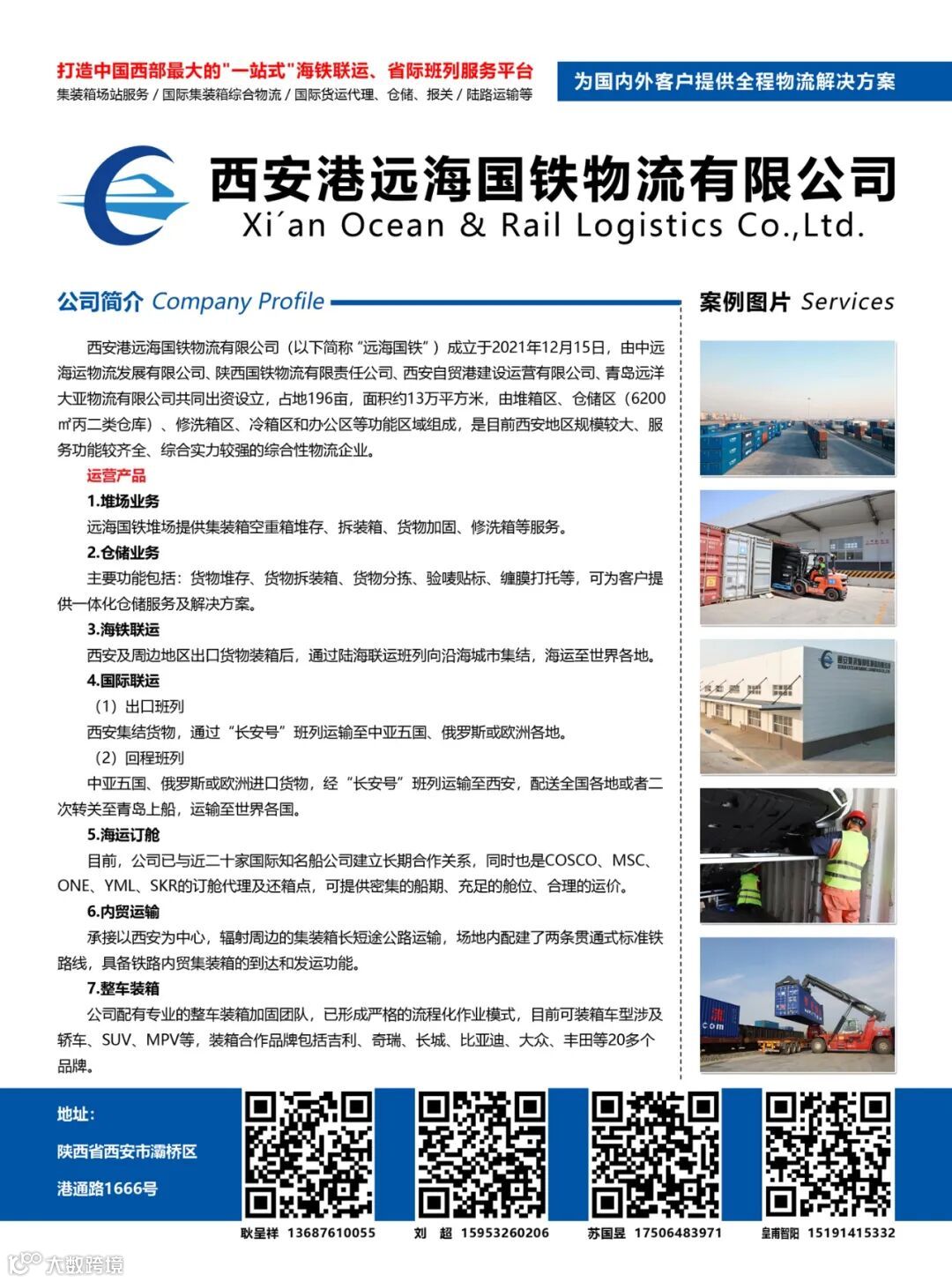 西安港远海国铁物流有限公司(简称“远海国铁”)成立于2021年12月15日,由中远海运物流、陕西国铁物流、西安自贸港建设和青岛远洋大亚物流联合投资设立。公司占地13万平方米,设有堆箱区、6200㎡丙二类仓储区、修洗箱区、冷箱区和办公区,是西安地区规模领先、功能完备的综合性物流企业。
