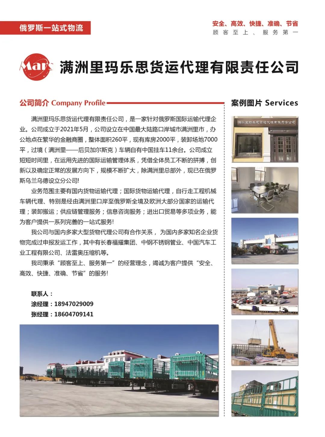 满洲里玛乐思货运代理有限责任公司成立于2021年5月,立足中国最大陆路口岸满洲里市。公司坐拥260平米办公区及9000平米仓储场地(含2000平米库房、7000平米装卸区),配备11台自有跨境牵引车。通过先进运输管理体系与专业团队,已建成覆盖中俄欧的物流网络,并在俄罗斯乌兰乌德设立分支机构。
