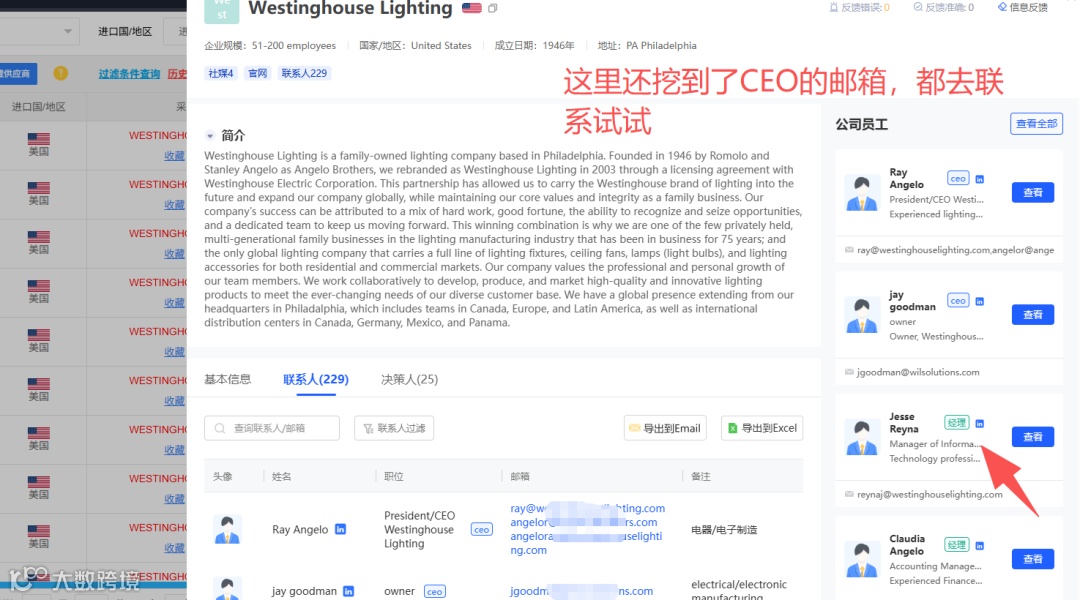决策人挖掘功能显示原联系经理Jesse Reyna仍任职,邮箱有效,可直接邀约面谈。同步推送新品信息可激发潜在合作意向。