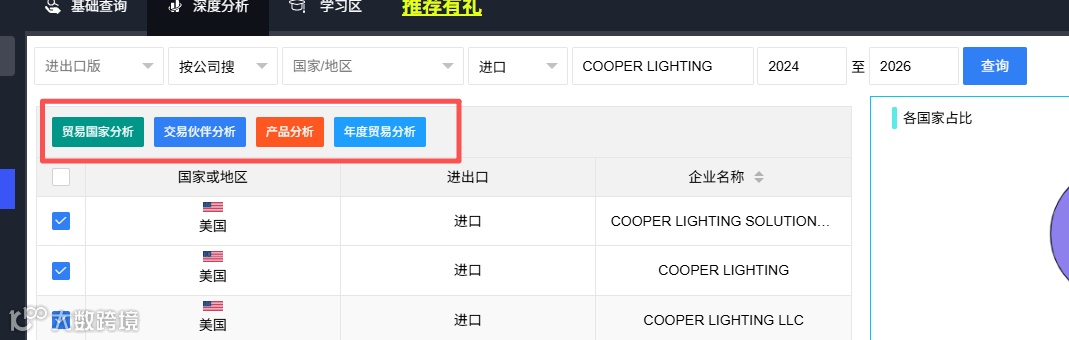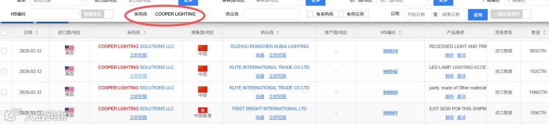 对广交会收集的客户名片进行海关数据核查。例如,COOPER LIGHTING公司名查询结果证实其真实采购行为。