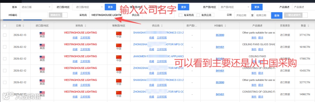 针对沉寂老客户,运用海关数据验证其采购现状。例如,查询WESTINGHOUSE LIGHTING发现其仍在高频采购且主要从中国进货,表明合作基础仍存。