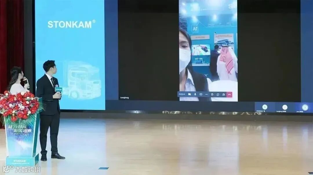 但今天我们还有一波销售人员以高昂的工作热情和认真负责的态度战斗在工作的第一线,我们现场连线了远在迪拜参展的一线销售人员,感谢她们的艰辛付出,您们辛苦了!