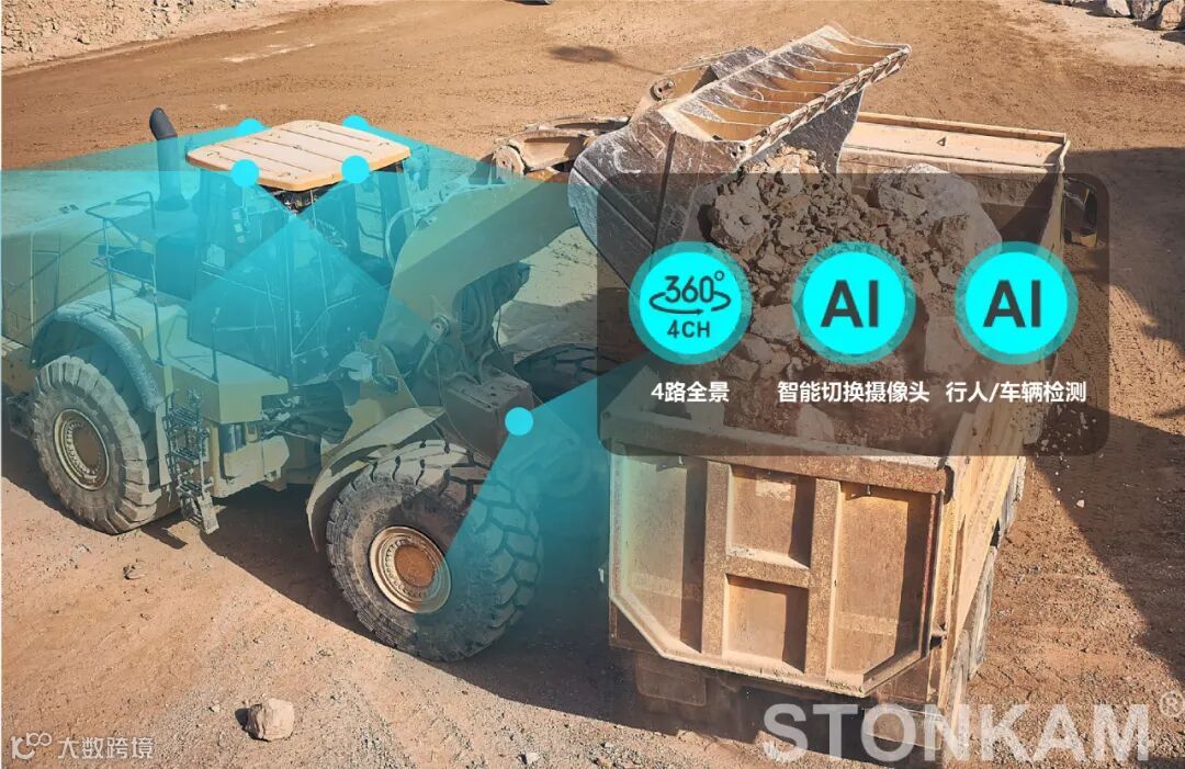 当装载机作业时,抬起的铲斗极易遮挡前方视线。敏视4路360°全景监控系统在铲斗位置搭载上下双摄像头,自动识别作业状态与周围人员位置: