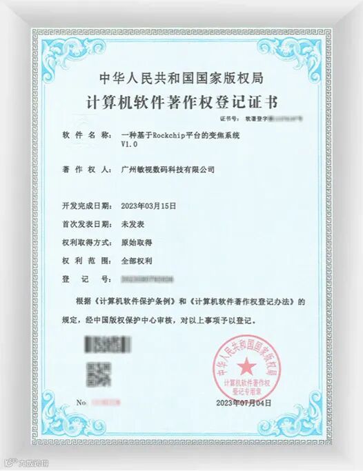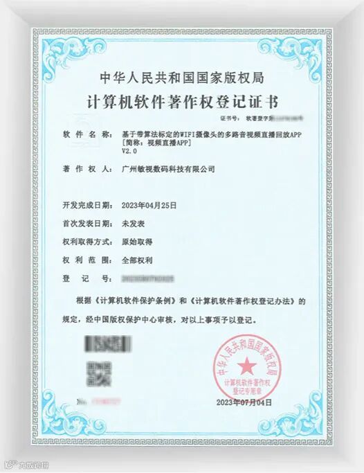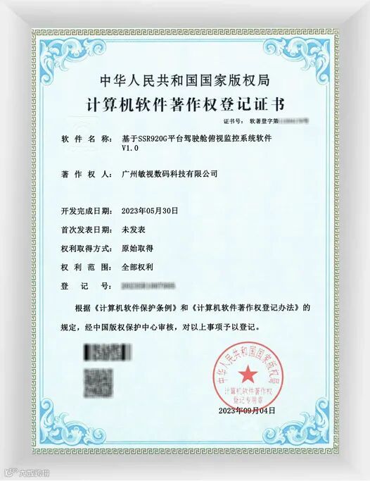 这四项软件著作权分别是:基于带算法标定的WIFI摄像头的多路音视频直播回放APP V2.0、一种基于Rockchip平台的变焦系统 V1.0、基于SSR920G平台驾驶舱俯视监控系统软件V1.0、跨平台多路视频同步播放器程序 V2.0.1。这些软件系统都是敏视在车载监控领域的重要组成部分,也是其核心技术的体现。