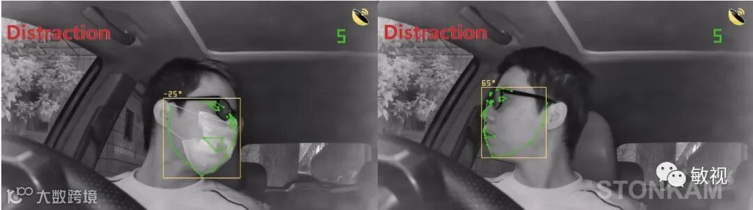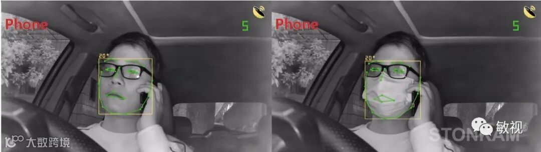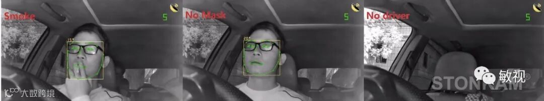 司机在驾驶过程中出现任何异常驾驶行为(疲劳,分心,吸烟,打电话,打哈欠,无司机和无口罩)、佩戴红外阻断眼镜、未系安全带和遮挡摄像头,敏视DMS驾驶员状态监测系统将发出声音及视觉警报。