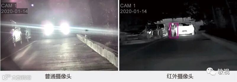 上图是在黑夜,使用敏视车载高清红外热像仪和一般可见光摄像头同时拍摄的场景图,从图像效果来看,因为光线影响,可见光摄像头能见度较低,红外热成像图像完全没有受到可见光的影响,依然可以清晰地探测远处的行人!