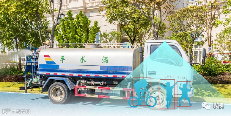 而对于敏视明星产品——高清四分割AI预警&雷达系统来说,它集成了AI行人侦测、盲区检测预警等功能点,可帮助洒水车等大型环卫车辆减少盲区的威胁。安装在车辆侧前方的AI行人侦测BSD摄像头智能精准检测环卫车辆A柱盲区的行人、骑行者,最大程度改善驾驶员视野,主动预警司机远离驾驶危险。