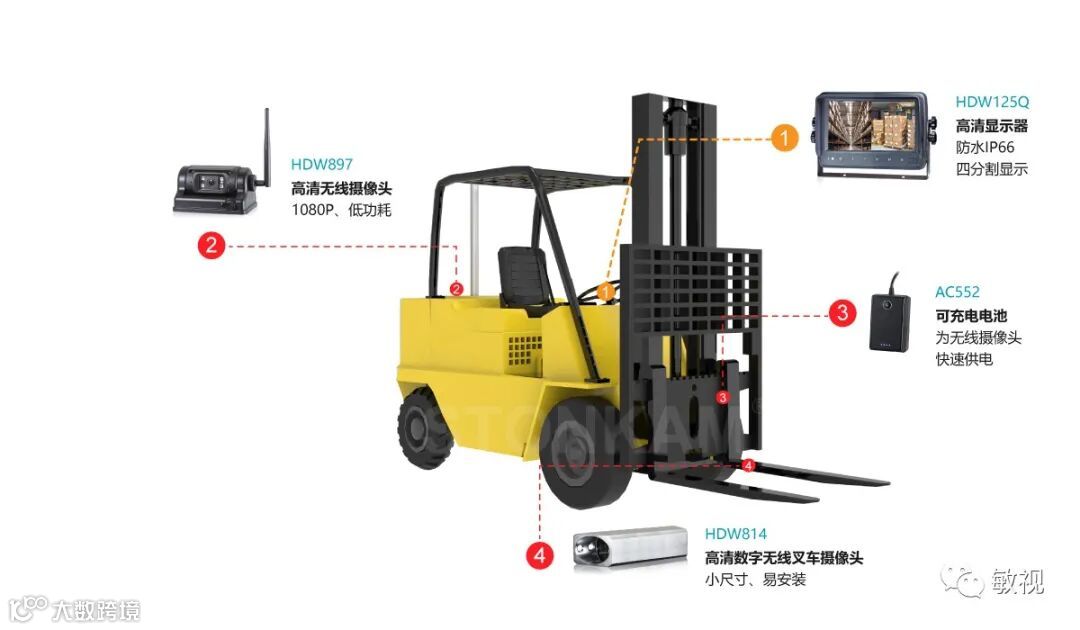 显然,运用监控管理系统是叉车安全管理最有效的方法之一。提供创新优质产品,为人类的美好生活做贡献。敏视自主开发的7寸高清无线叉车监控系统,专用于叉车,增加驾驶可视范围,无损安装、免布线、通电即用,传输距离可达120米,可有效防止事故发生,同时清晰观察人员的精准位置。该系统已经广泛应用于工厂、物流园区、港口码头等需要叉车作业的场景中。
