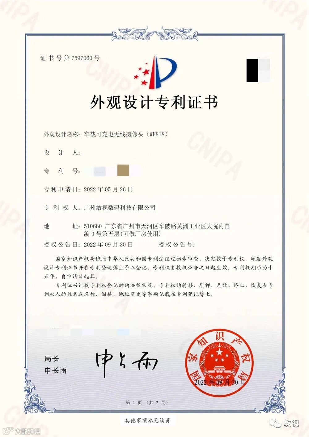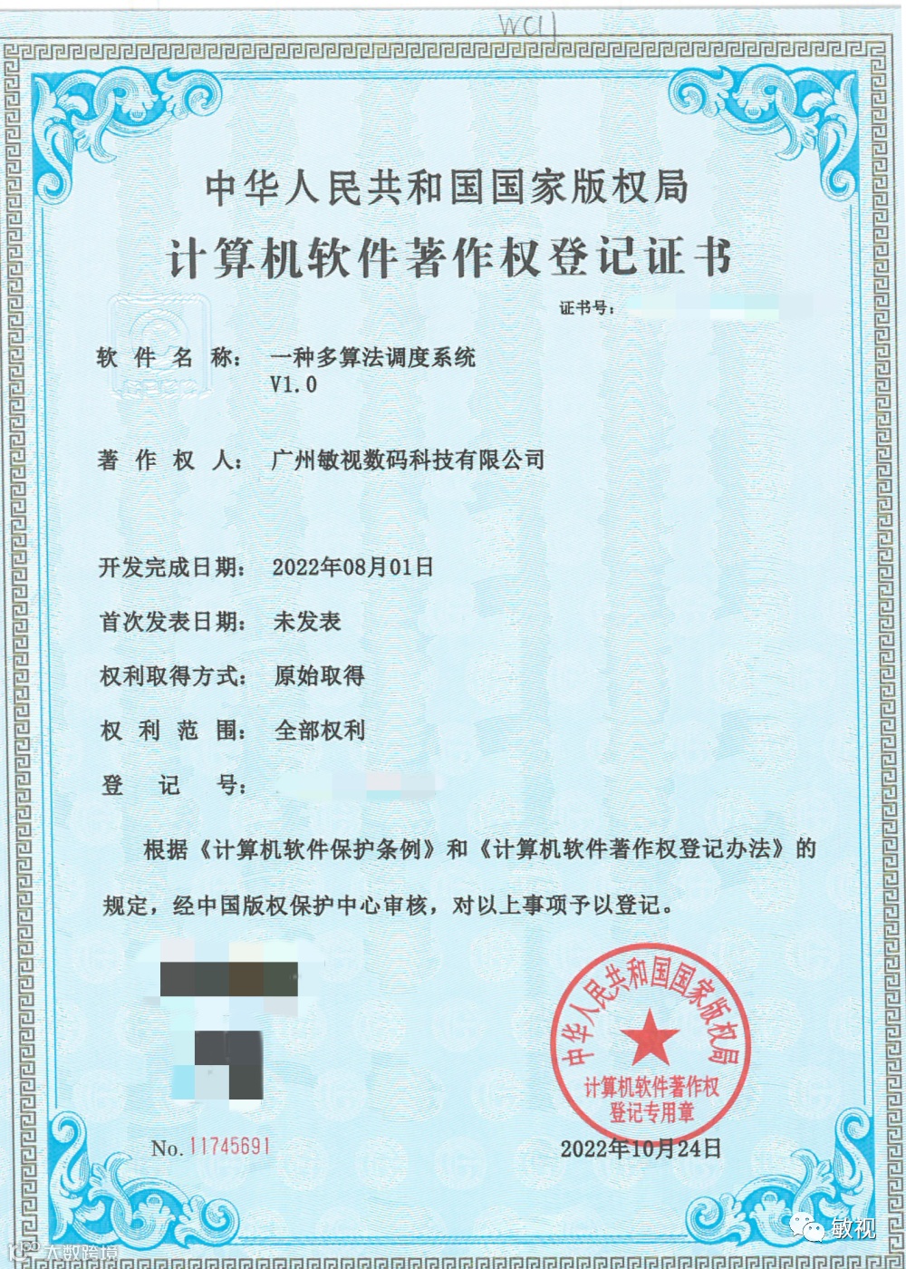 近日,敏视申请的1项外观设计专利+3项计算机软件著作权,由国家知识产权局依照《中华人民共和国专利法》进行审查通过正式授予证书!