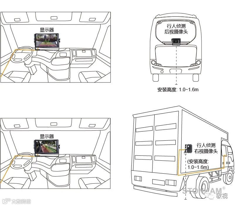 摄像头可安装在车辆前方、后方及侧边,安装高度建议在1.0-1.6m范围内。