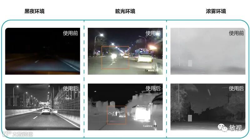 光线强烈变换,也是驾驶痛点之一。敏视AI热成像双光摄像头系统不受可见光限制,通过屏蔽炫目强光,使得司机能观测到正常亮度路面,不受任何干扰,减少其在驾驶时受眩光以及路面雪天反光的影响!