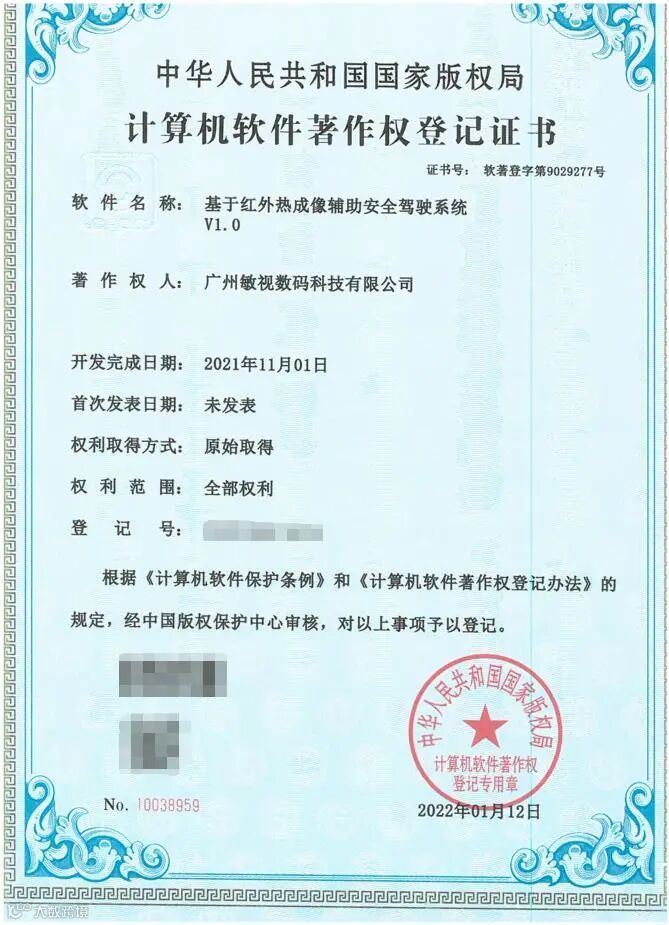 敏视不仅在硬件上表现出色,还不断追求在软件方面的专业性。这次证书的获得说明敏视的红外热成像技术得到国家认可,在智能车载领域的建设上更进一步。敏视作为一家国家高新技术企业,申请计算机软件著作权,不仅是为了响应国家政策,还反映了公司在自主知识产权成果方面的开发能力。
