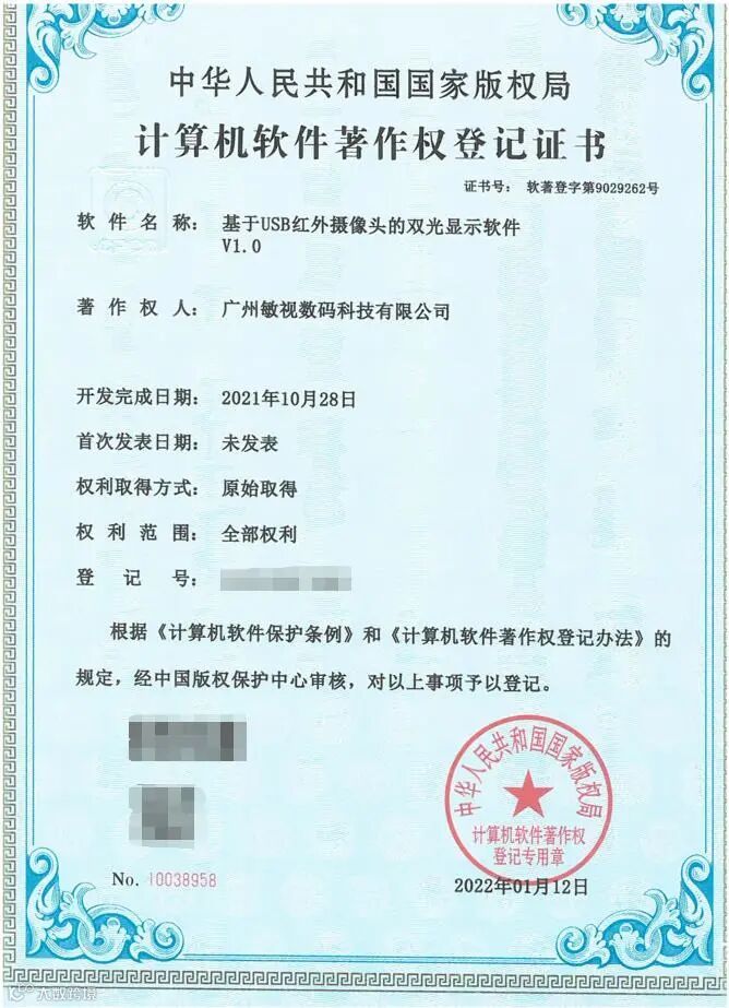 近日,广州敏视数码科技有限公司收到中华人民共和国国家版权局颁发的3项计算机软件著作权登记证书!