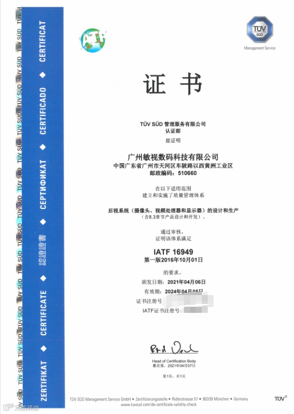 近日,广州敏视数码科技有限公司顺利通过IATF16949质量管理体系现场审核。本次审核为IATF16949换证审核,TÜV南德认证公司的审核专家组按照IATF16949:2016标准对敏视质量管理体系运行情况进行为期3天的审核。