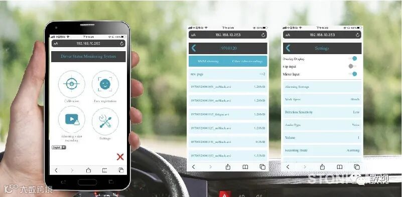 驾驶员疲劳监测系统可以通过Wi-Fi连接到手机上的APP。APP上提供设备配置,文件上传和其他功能。