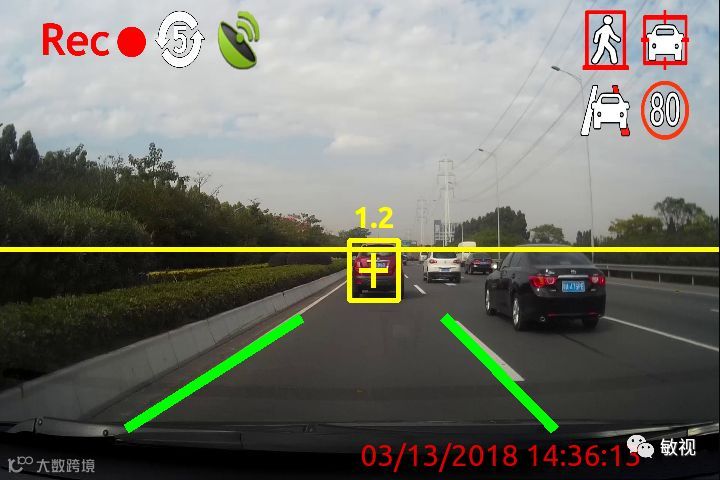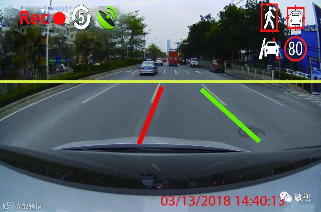 通过对行车视频进行处理和分析,能准确收集并分析车道线信息,当监测到司机在不打转向灯的情况下偏移车道时会立即发出警报,预防因车道偏离而可能造成的交通事故。