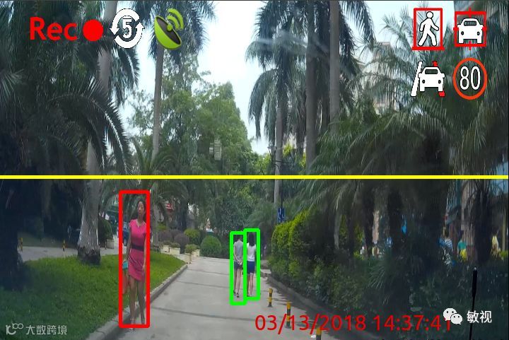 基于大数据下的深度学习技术,可智能侦测车辆前方是否有行人、骑行者等目标对象,并能精准分析车辆速度与目标对象的距离信息,当判断有碰撞风险时,会立即向司机发出警报,以避免发生碰撞事故。