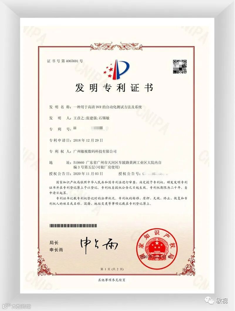 2020年11月3日,敏视荣获一项由国家知识产权局颁发的发明专利证书——《一种用于高清DVR的自动化测试方法及系统》。这是敏视首个获得的发明专利,实现了公司在发明专利上“零”的突破,这是敏视科技工作取得的又一重大突破,标志着敏视在技术创新和知识产权保护工作中迈出了重要一步,是公司强化科技创新,加强知识产权建设,重视研发团队建设、加大科研投入取得的创新成果。
