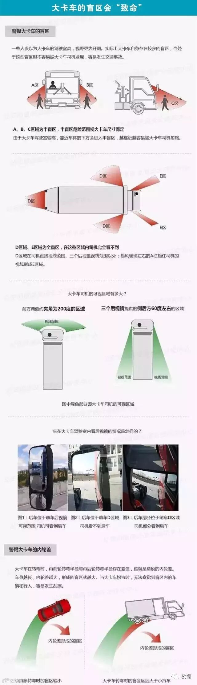 从小妈妈就教导,遇到大卡车时,要做到避让不抢行。注意避免长时间在大卡车右边行驶,不尾随大卡车,与大卡车保持安全的距离。为什么呢?下面一张图带大家解开心中的疑惑!